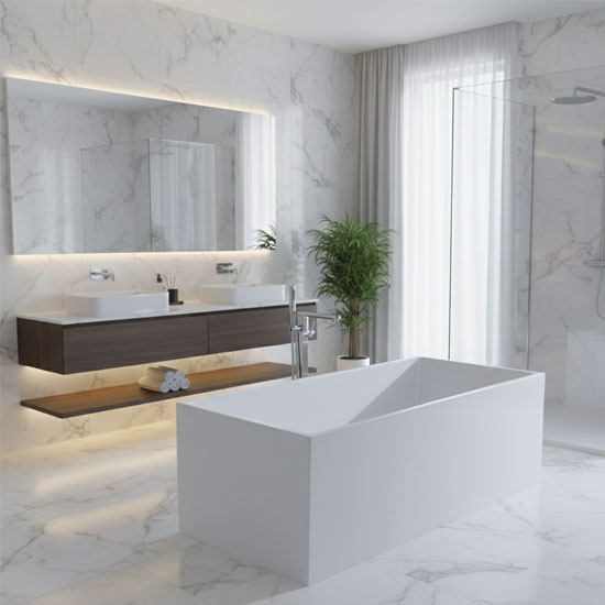 - Đây là kiểu bồn tắm độc lập nghệ thuật. Giúp chủ nhân tận dụng view tối đa mang cả thiên nhiên vào phòng tắm.