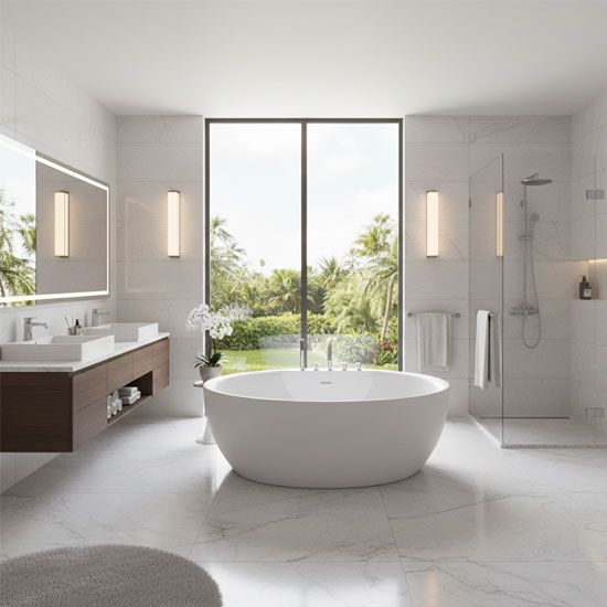 - Đây là kiểu bồn tắm độc lập nghệ thuật. Giúp chủ nhân tận dụng view tối đa mang cả thiên nhiên vào phòng tắm.