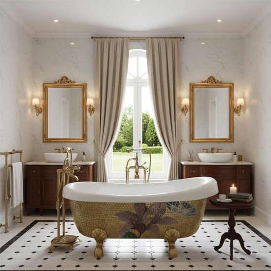 - Đây là kiểu bồn tắm độc lập nghệ thuật. Giúp chủ nhân tận dụng view tối đa mang cả thiên nhiên vào phòng tắm.