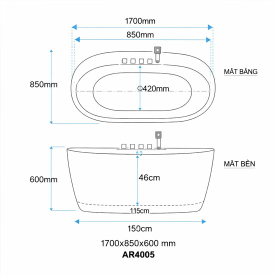 - Bồn tắm Ares với thiết kế phù hợp với mọi không gian phòng tắm khác nhau.