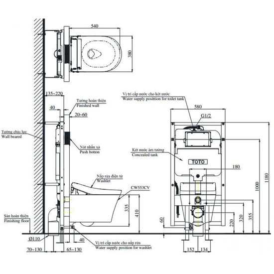 - Bồn cầu TOTO CW553C/TCF34570GAA/WH172AAT/ TCA502/MB174P#SS treo tường