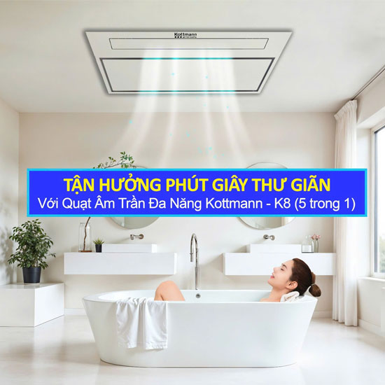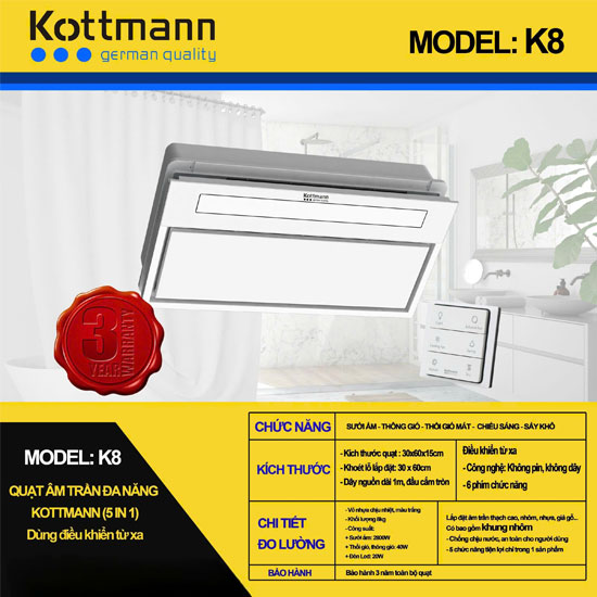 Quạt sưởi âm trần đa năng Kottmann K8 là dòng quạt âm trần 5 chức năng: Sưởi ấm, sấy khô, thổi gió mát, thông gió–hút mùi và chiếu sáng bằng đèn led, được nhà hãng Häns cho ra mắt đầu năm 2025. Ngoài ra, quạt còn được trang bị thêm remote tiện lợi, có thể dễ dàng điều chỉnh tính năng theo nhu cầu.