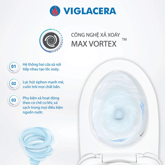Bồn cầu Viglacera V811 1 khối Xả rửa mạnh mẽ và hiệu quả. Sử dụng 100% lượng nước xả từ phía trên, tạo nên dòng xoáy cực mạnh rửa trôi mọi vết bẩn. Công nghệ xả Jet Turbo Vortex giúp làm sạch mọi vết bẩn.
