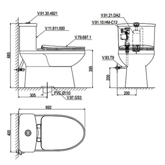 - Bàn cầu một khối V811 Thiết kế không vành trơn láng đặc biệt, không góc khuất, không chứa nước, không vết ghép vành giúp xóa bỏ nơi cư ngụ của vi khuẩn.