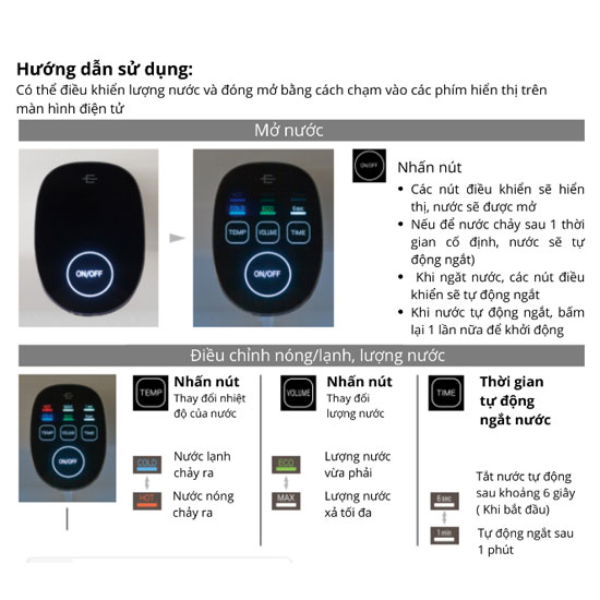 - Tính năng điều chỉnh tốc độ dòng chảy, thời gian xả nước và nhiệt độ nước nóng