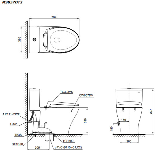 Bồn cầu Toto MS857DT2 nắp đóng êm TC393VS