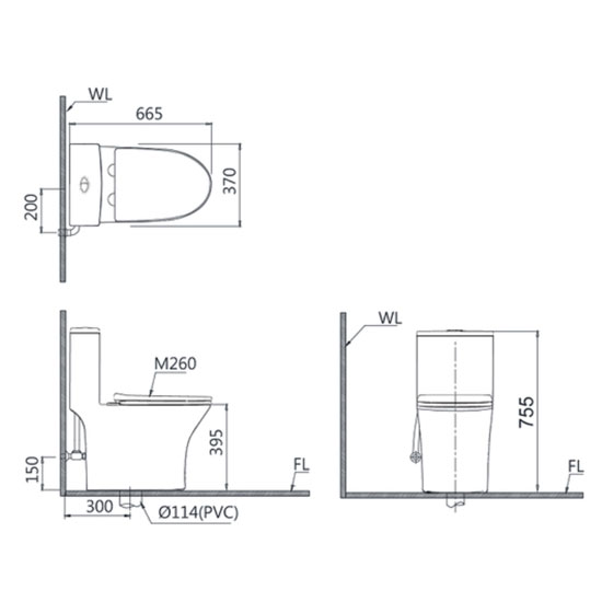 - Tâm thoát: 300mm