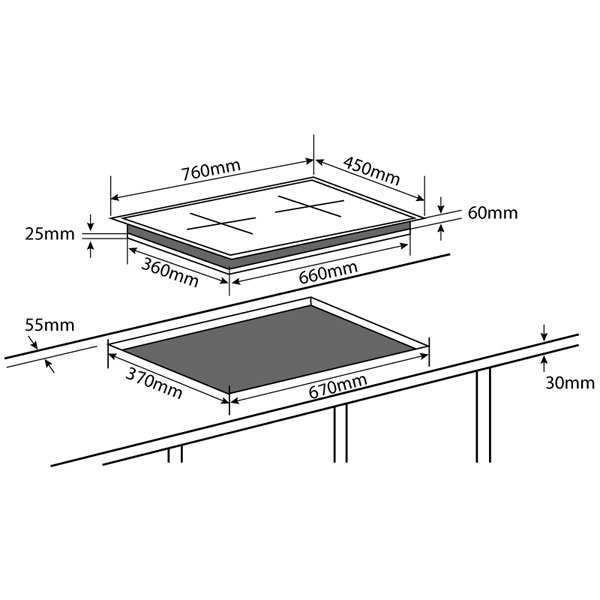 - Kích thước khoét lỗ: 670 x 370 mm