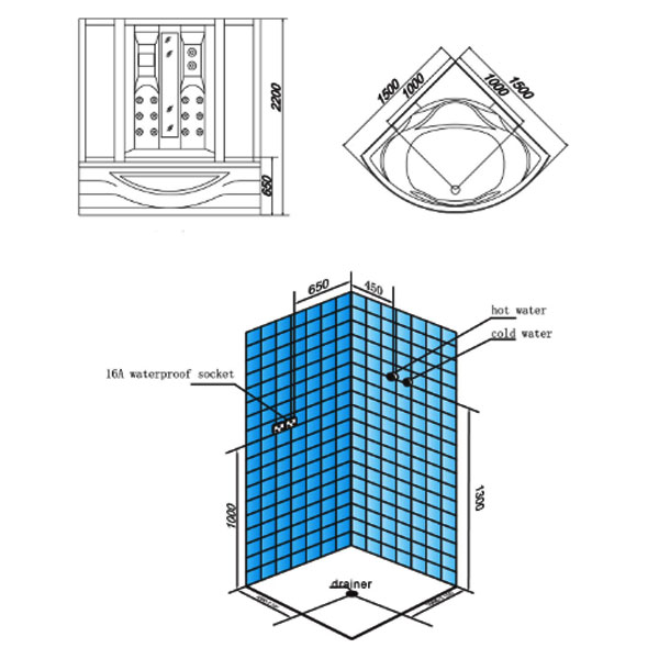 - Phòng xông hơi dạng góc, nhưng với kích thước khá to 1600x1600x2200 mm tạo không gian cực kỳ rộng rãi.