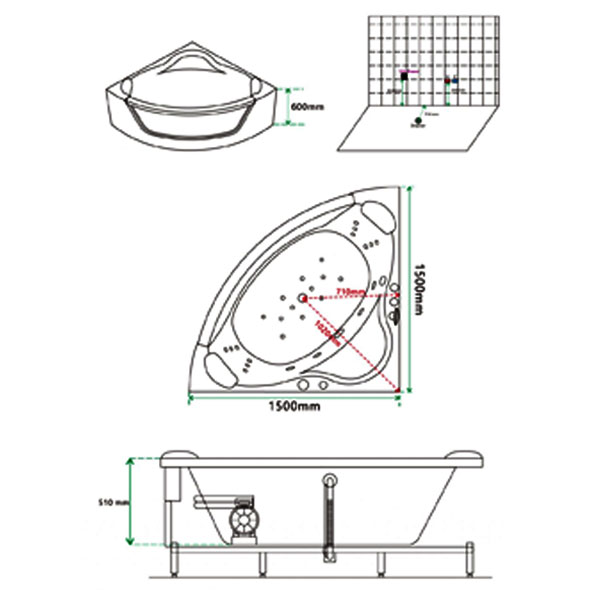 - Với kích thước 1500x1500x600mm đầy tiện lợi không gian dành cho cả hai người.