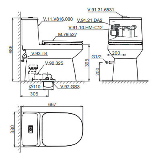 - Bàn cầu một khối V816 Thiết kế không vành trơn láng đặc biệt, không góc khuất, không chứa nước, không vết ghép vành giúp xóa bỏ nơi cư ngụ của vi khuẩn.