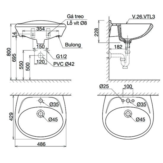 - Chậu rửa mặt lavabo treo tường Viglacera VTL3
