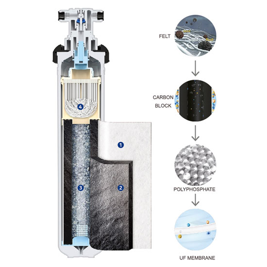 • Hệ thống lõi lọc nguyên khối, cút nối nhanh và kiểu dáng gọn gàng giúp việc bảo trì và thay lõi dễ dàng hơn.