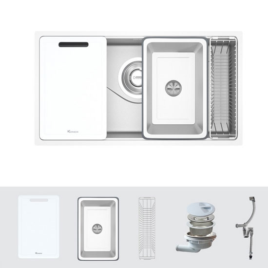 - Tích hợp phụ kiện thông minh: Thớt nhựa, rổ phụ, giá úp bát, siphon.