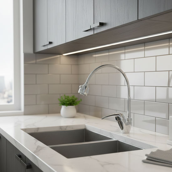 - Cần vòi mềm gắn chậu rửa bát, hiện đại.