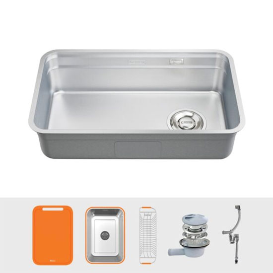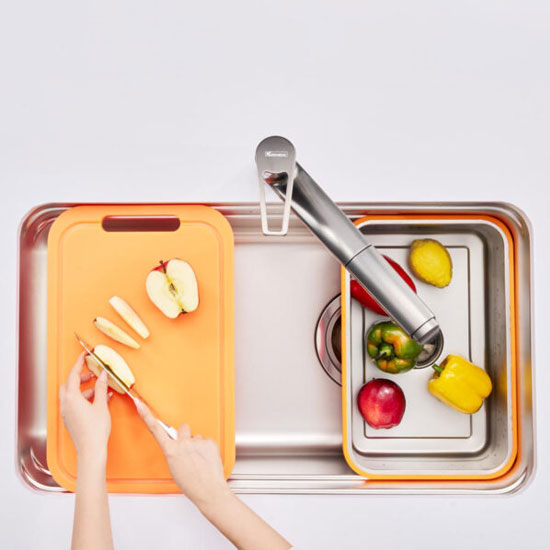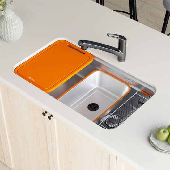 - Sản phẩm được tích hợp đầy đủ phụ kiện phục vụ nhu cầu hàng ngày của người nội trợ như thớt nhựa màu cam, colander và rổ phụ.