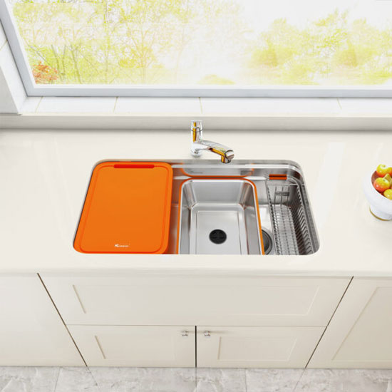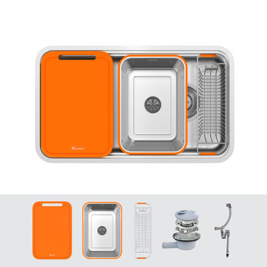 - Sản phẩm được tích hợp đầy đủ phụ kiện phục vụ nhu cầu hàng ngày của người nội trợ như thớt nhựa màu cam, colander và rổ phụ.