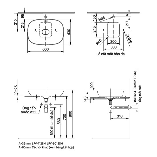 - Lỗ đặt vòi: Trên bàn / Gắn tường
