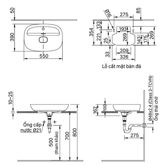 - Lỗ đặt vòi: Trên bàn / Gắn tường
