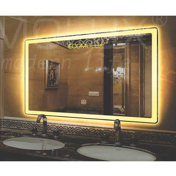 Gương phòng tắm khung inox mạ vàng tích hợp thêm đèn LED cảm ứng – là loại gương có thiết kế nút cảm ứng hiển thị trên mặt gương, bạn chỉ cần chạm nhẹ để bật tắt đèn led.